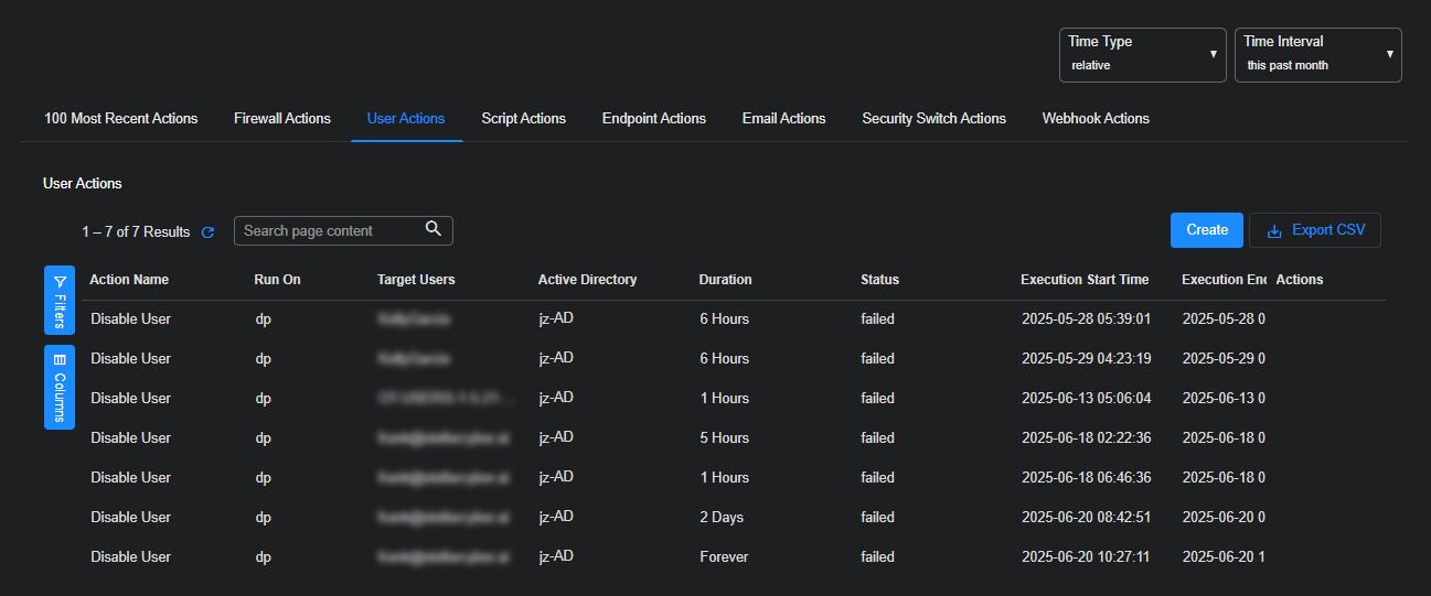 The Automation | Action History | User Actions tab displays the user actions taken by Stellar Cyber. If a user is disabled manually from the Event Display or automatically by Automated Threat Hunting, that action appears here.