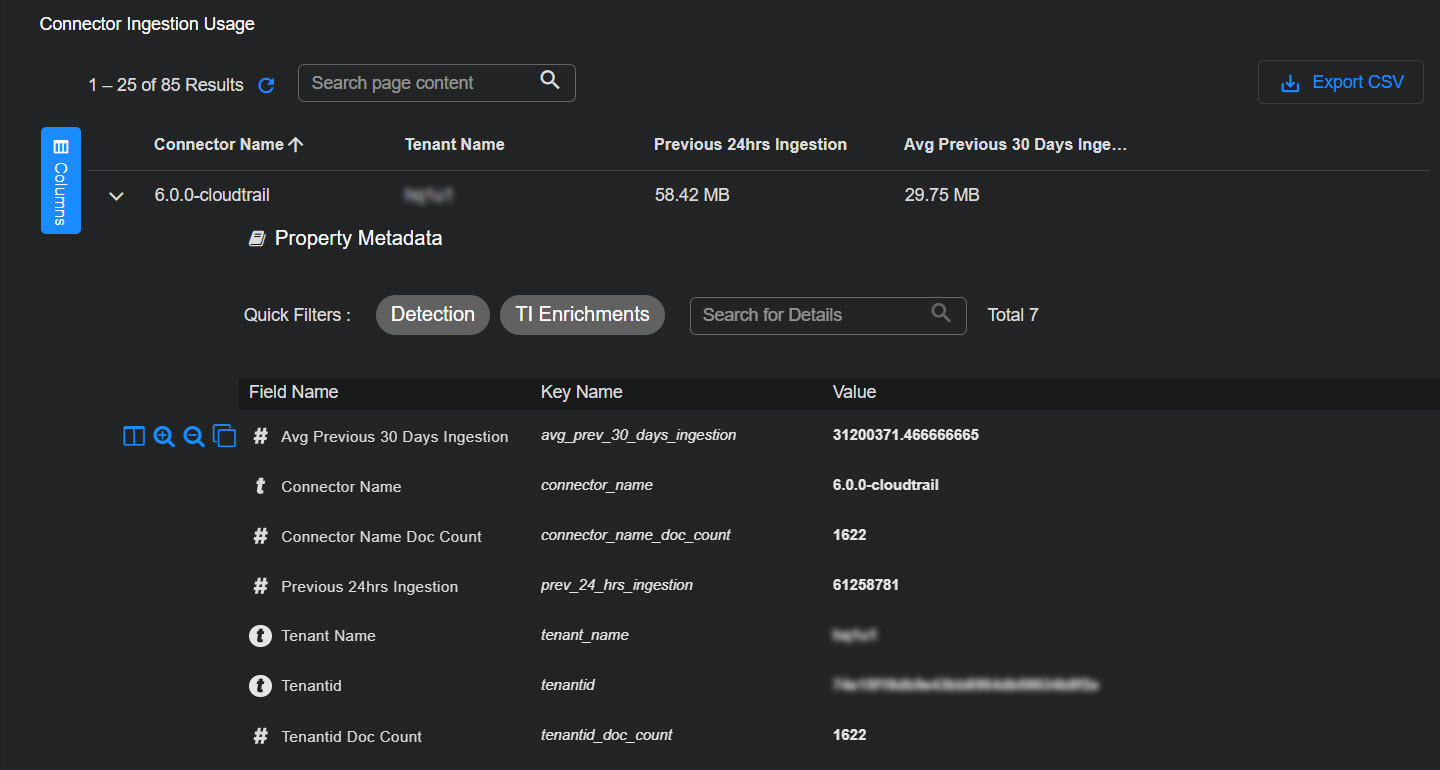 Each of the tables in the Ingestion Dashboard supports standard table actions, including search, sort, CSV export, column change, and table refresh.