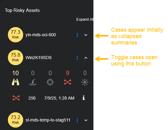 • Top Risky Assets Panel – Lists collapsible capsule summaries of the top risky assets by score with multiple drilldowns for further analysis.