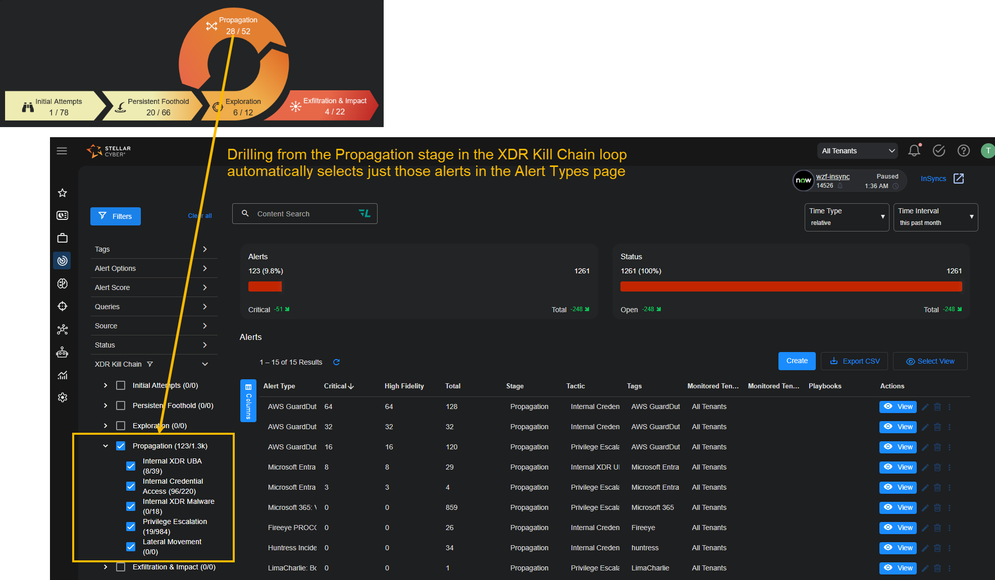 You can select any of the stages in the XDR Kill Chain loop to drill to the Alerts page with a display filter automatically applied so that just the alert types at the selected stage are displayed, as illustrated in the figure below.