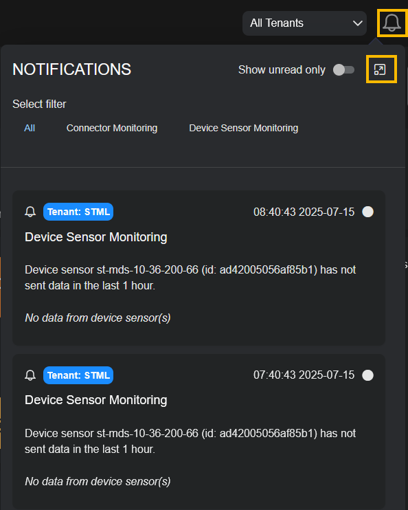 • Select the alarm bell icon to open Notifications to show you the number of unread system notifications. Select the icon to launch the Notification Center. Users with appropriate access can specify rules that govern how system notifications are generated in the System Action Center.