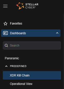 • If you have not changed your home page by selecting the Set as homepage menu item from the upper, right-most icon, you can get back to the XDR Kill Chain dashboard by selecting the Stellar Cyber logo at the upper left of the display or by selecting the Dashboards | PREDEFINED | XDR Kill Chain menu item.