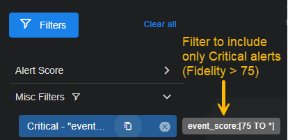• The number on the left reports the number of critical alerts within the current filters. These alerts have been scored by machine learning services with a Alert Score of 75 or greater and are most likely to need immediate attention.