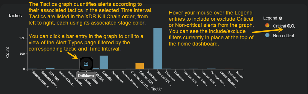 • Tactics are listed in XDR Kill Chain order, from left to right along the x-axis of the graph. Bar graph entries for each tactic are displayed in their corresponding XDR Kill Chain stage color.