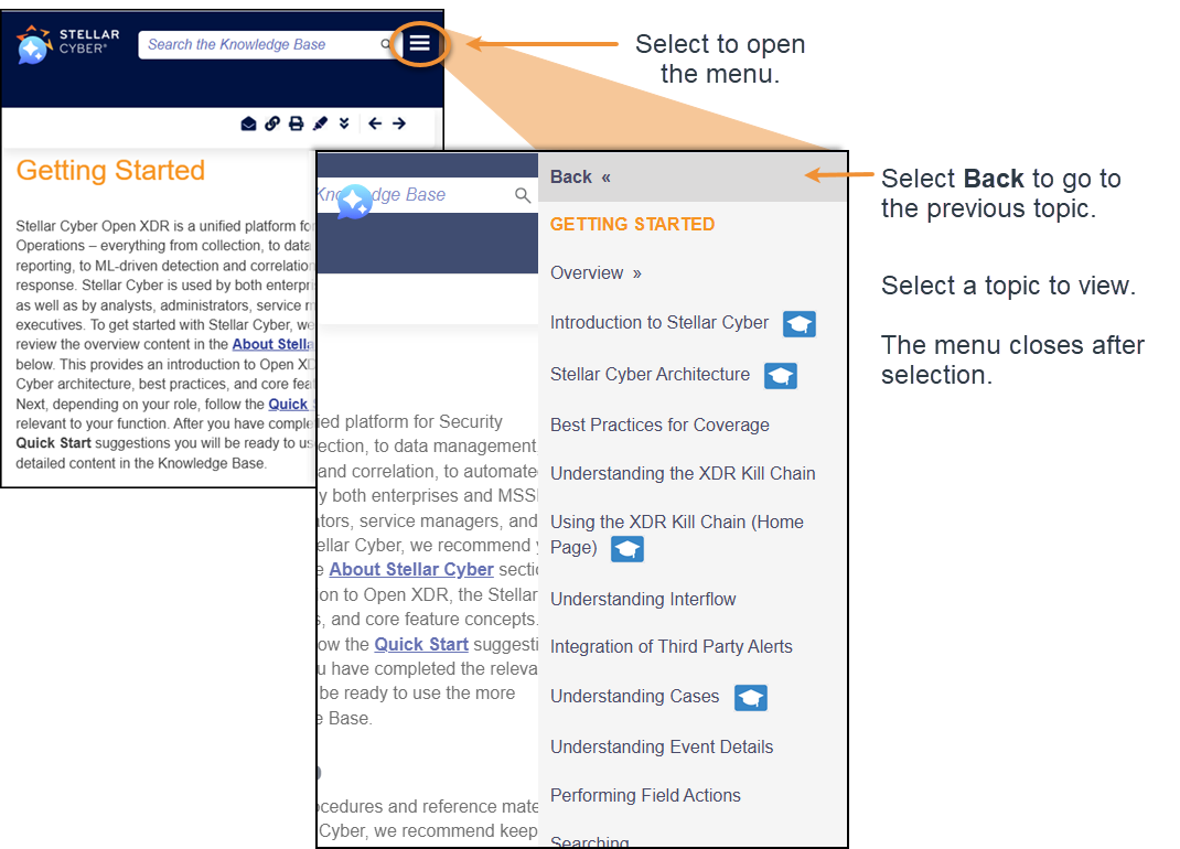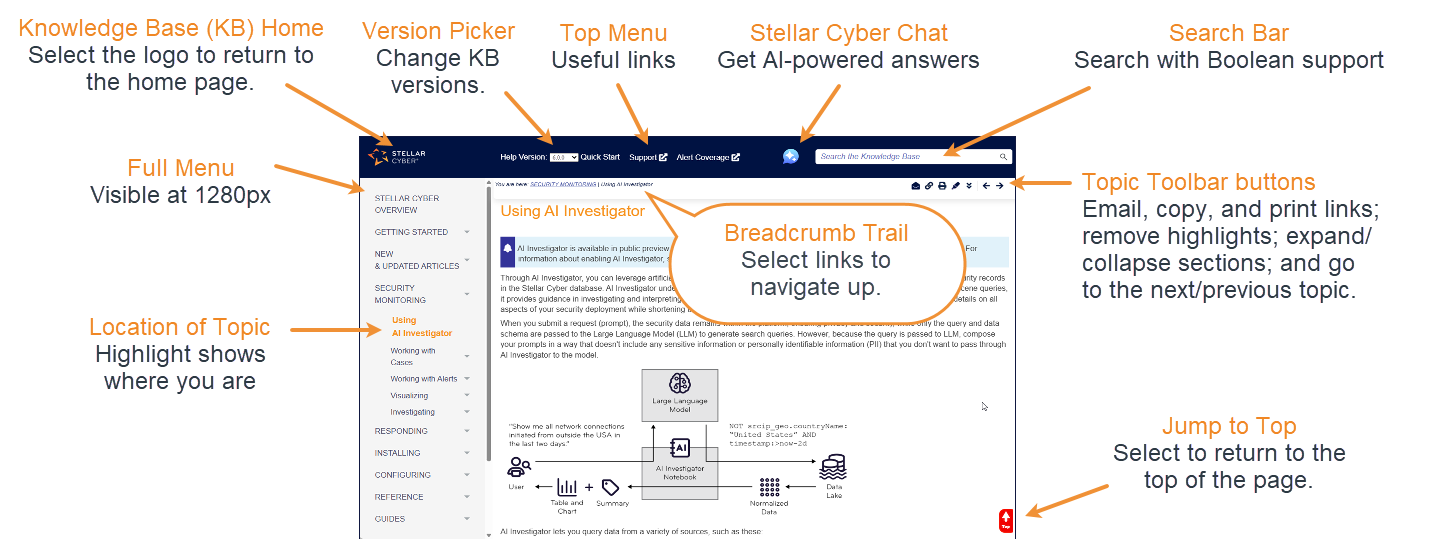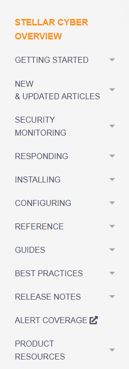 The knowledge base content is organized by need to interact with the product. This helps you find content based on the task you need to perform. The menu is structured with overview and analysis topics first, as those are the most likely to be frequently used in the long term. Those menu options are followed by administrative and reference topics, which will hopefully be less needed over time as you use the product. This task-based structure augments the contextual links in the Stellar Cyber UI, which provide UI-oriented navigation of the knowledge base.