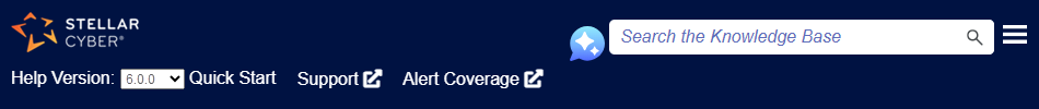 The brief Top menu is always displayed for any browser scaled wider than a mobile screen. It provides you access to the Quick Start topic, the Stellar Cyber Customer Success Portal (Support), Alert Coverage, the Search field, and the Stellar Cyber Chat feature at all times. The Quick Start is helpful for both analysts and administrators to revisit as you learn the product.