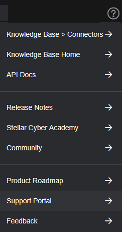 icon to view the menu items: Knowledge Base <specific article>, Knowledge Base Home, API Docs, Release Notes, Stellar Cyber Academy, Community, Product Roadmap, Support Portal, and Feedback.