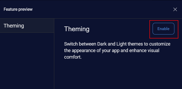 In the Feature preview dialog, click Enable for Theming.