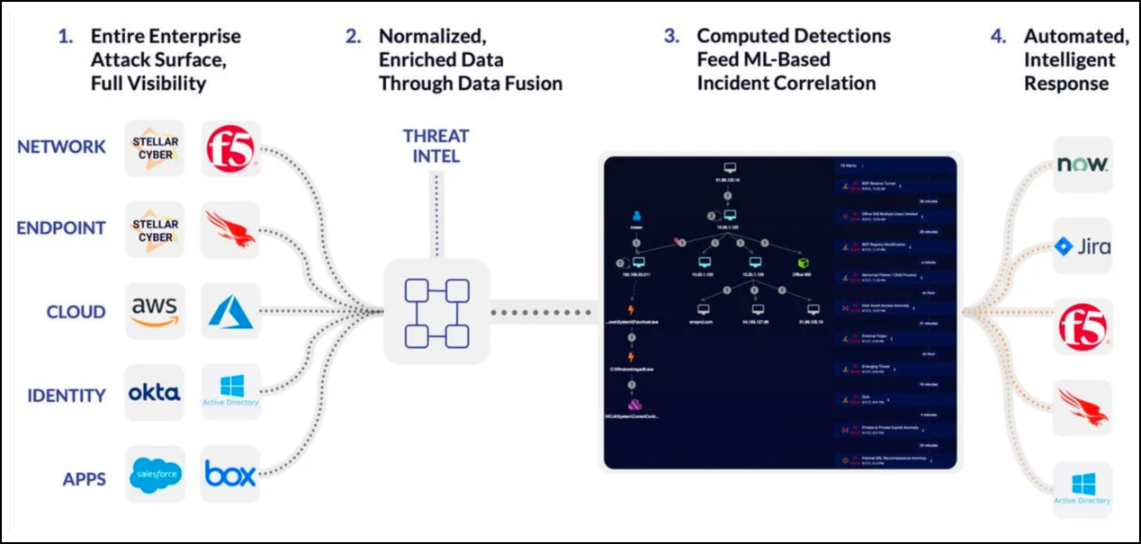 The objective of the Stellar Cyber Platform is to deliver an efficient and easy-to-use approach to defending the entire attack surface. Conceptually, there are four parts to the platform to accomplish that, as illustrated and described below: