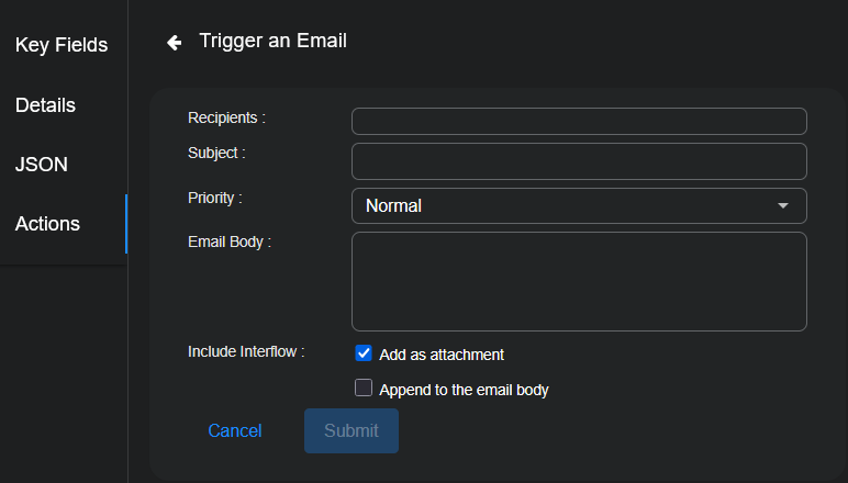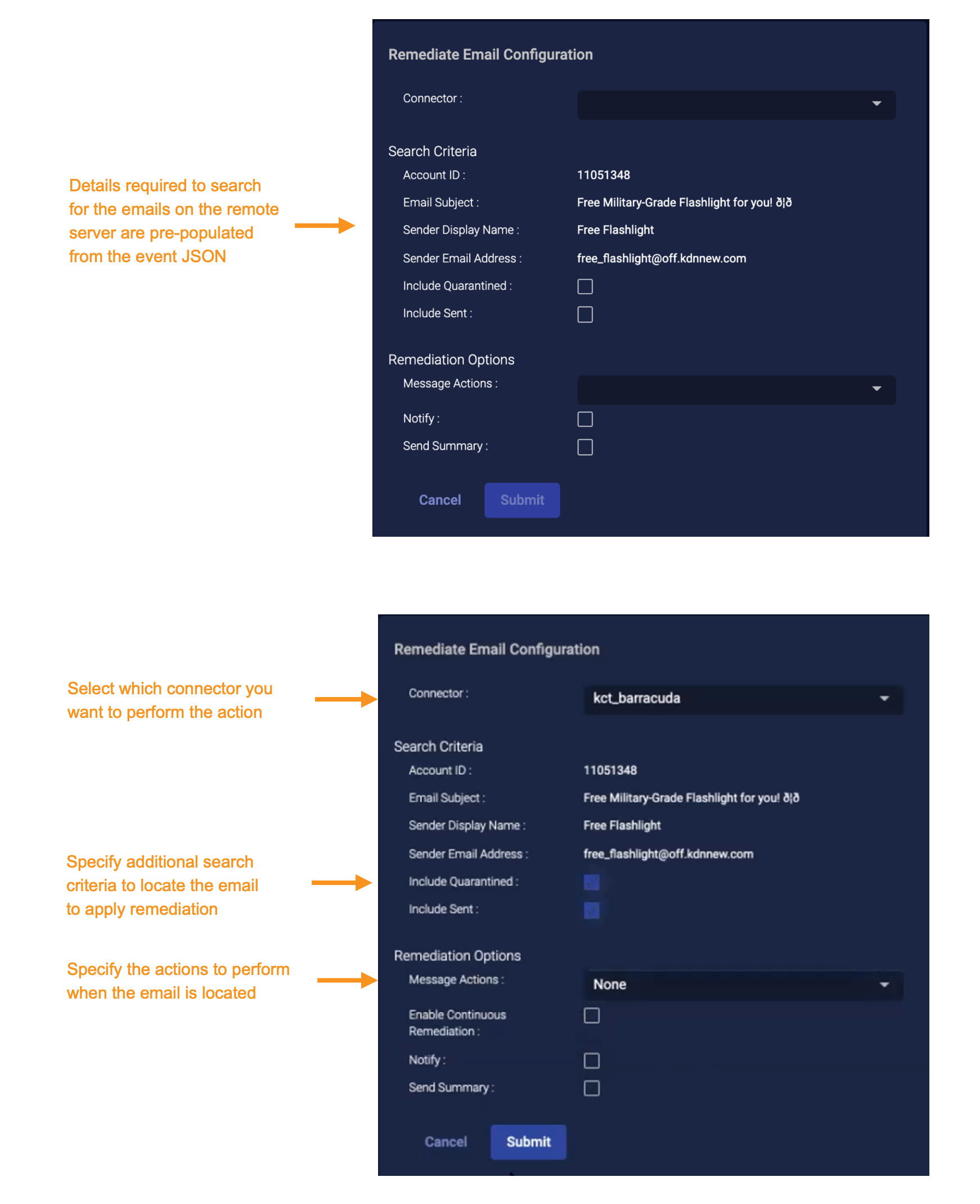 1. From the event display, select the Actions tab, and click Remediate Email. The dialog appears with some sections pre-populated from the JSON associated with the selected event.