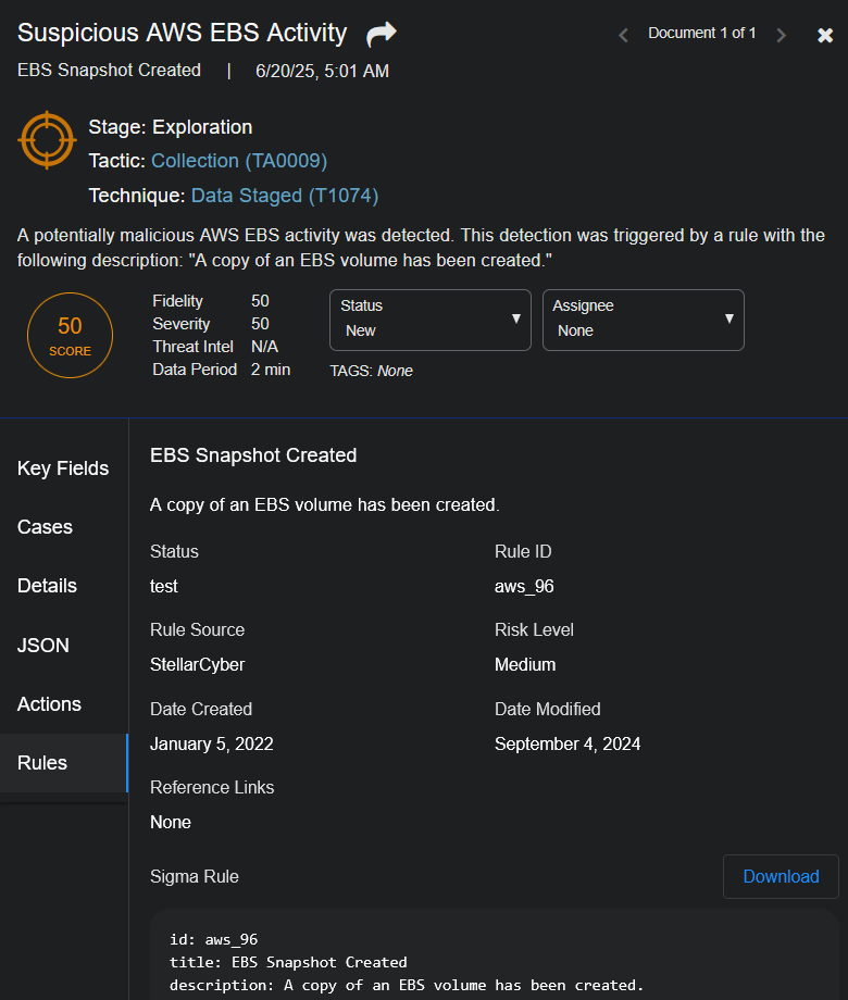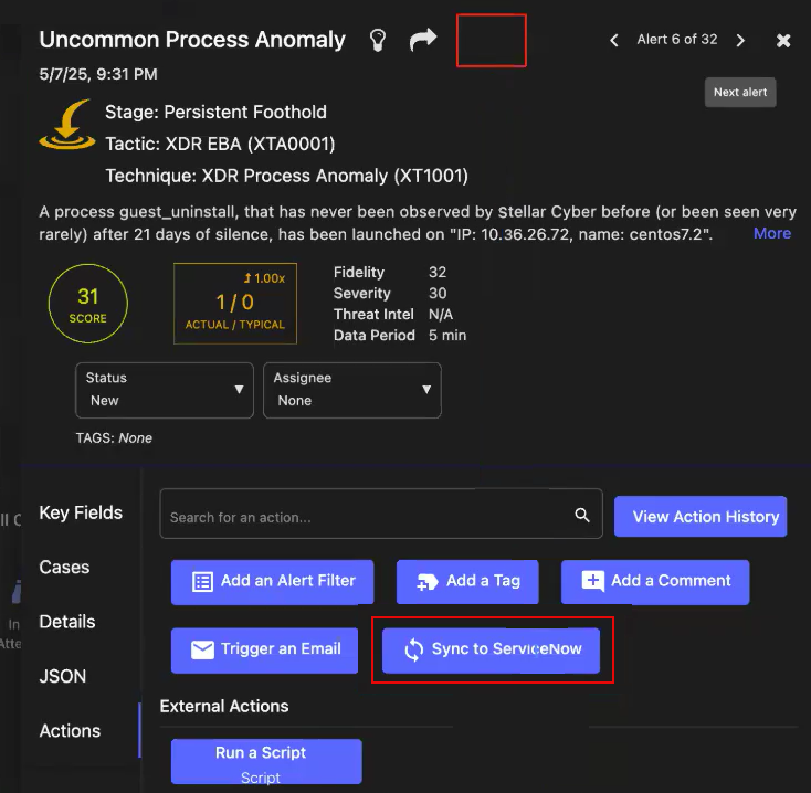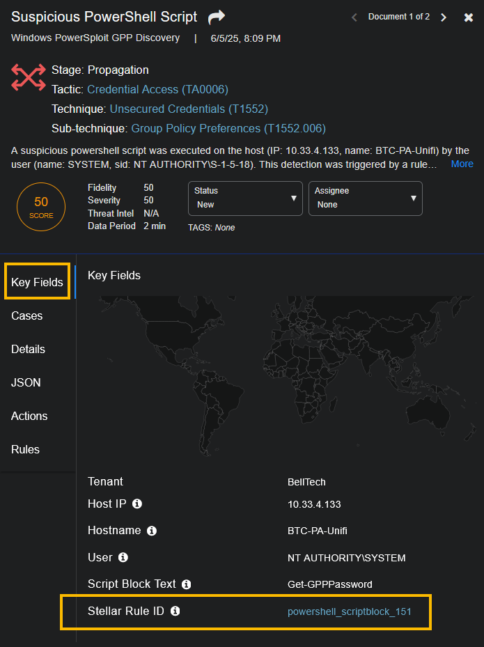 To get the Knowledge Base description for rule-based alerts, in the Key Fields, click the Stellar Rule ID link, for example, powershell_scriptblock_151.
