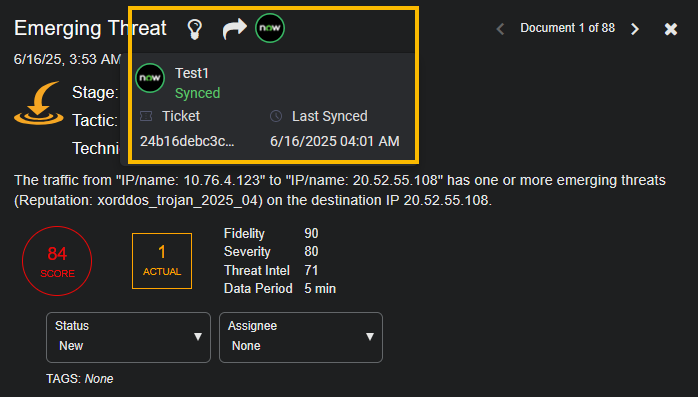When you hover over the ServiceNow icon, the status, Ticket ID, and Last Synced date and time are displayed.
