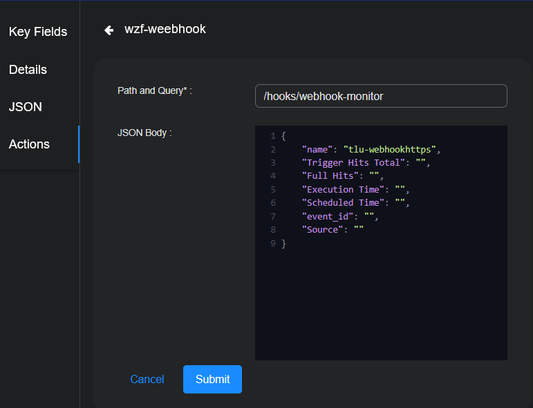 2. (Optional) When the Webhook Responder is triggered manually, you can edit the Path and Query and the JSON Body when you issue the action.