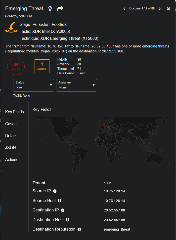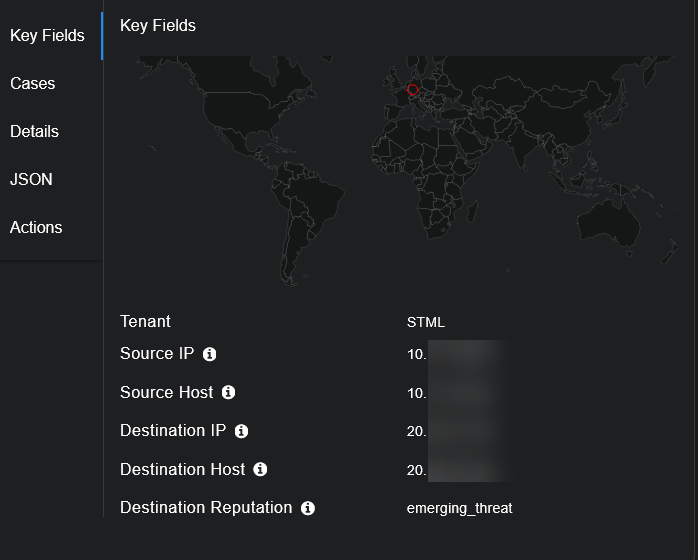 The Key Fields includes a global map on which the geolocation of the source and destination IP addresses are plotted with a connecting arc. For applicable alerts such as User Login Location Anomaly, the map includes data points for the closest typical login locations of that user.