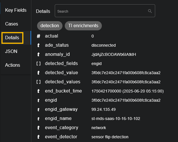 Stellar Cyber provides several options to help you more quickly find the information you're looking for in the Details section: quick filters and a search field.