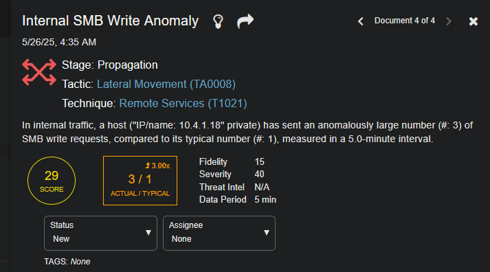 • Fidelity– our confidence in our analysis. The higher the Fidelity Score, the higher our confidence that we correctly observed a malicious event. If this is high, it drives the Alert Score higher. If this and the Threat Intel score are low, they reduce the Alert Score.