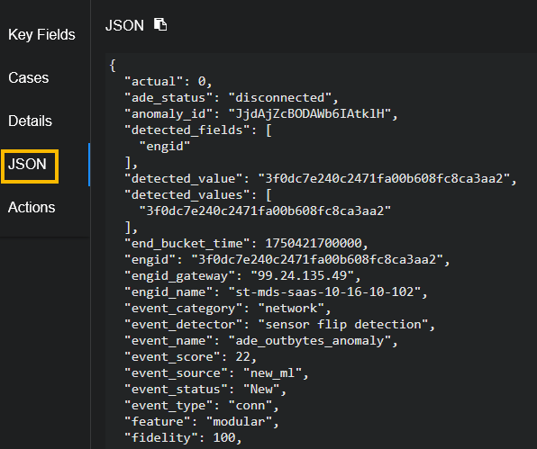 • Machine Learning – This orange rectangular block is displayed for events other than raw data or straightforward traffic events. Alert types handled by Stellar Cyber Machine Learning may include this block to highlight key triggers, such as actual versus typical, that contributed to the alert scoring. Note the difference in key triggers illustrated in the example images above.