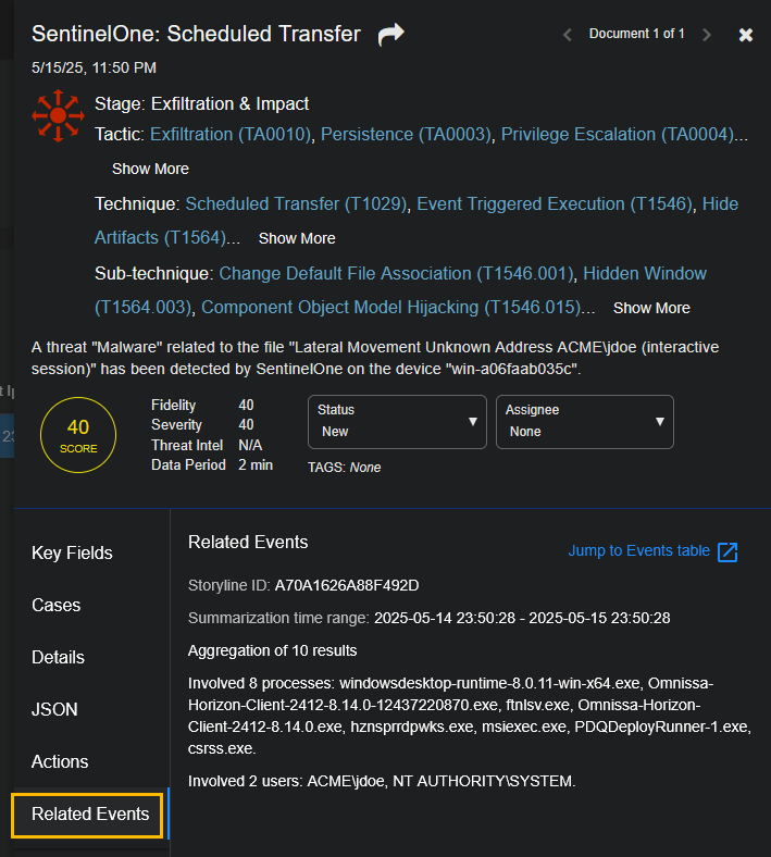 The Related Events tab only displays if the alert type is SentinelOne. The tab contains a summary of related SentinelOne Deep Visibility events. For details, see Related Events for Alert Types.
