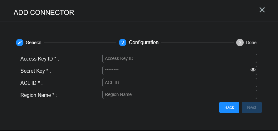 Access Key ID, Secret Key, ACL ID, and Region Name