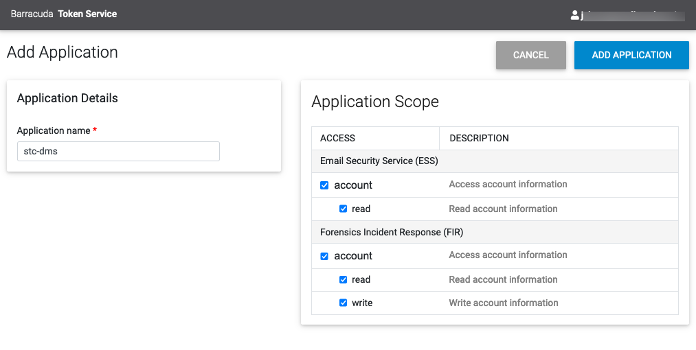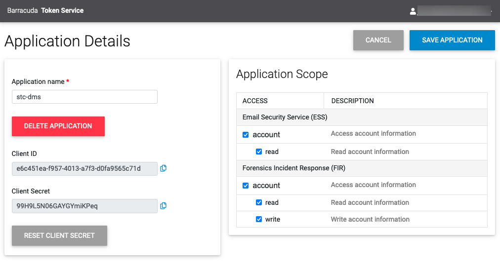 Use the Barracuda token service to register an application for communication between Stellar Cyber and the Barracuda Email Gateway Defense system. Log in to: https://login.bts.barracudanetworks.com/register. (Steps are also provided on Barracuda's documentation site.)