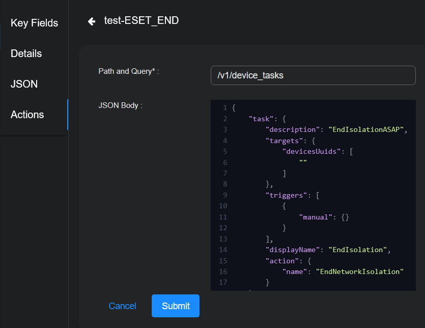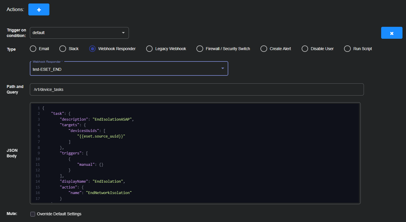 Select a previously configured ESET Responder from the dropdown menu for the Webhook Responder. The template populates the fields in the Path and Query and JSON Body.