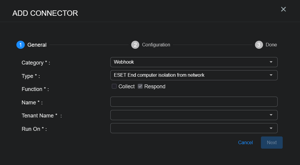Choose a Tenant Name. This identifies which tenant is allowed to use the connector. In addition to specific tenants, this connector supports All Tenants, which means that an ESET Responder can be used across tenants.