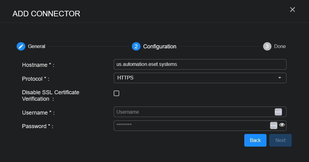 Username and Password: To obtain a username and password, create an API user account following the guidance in the ESET documentation for Create API User account.