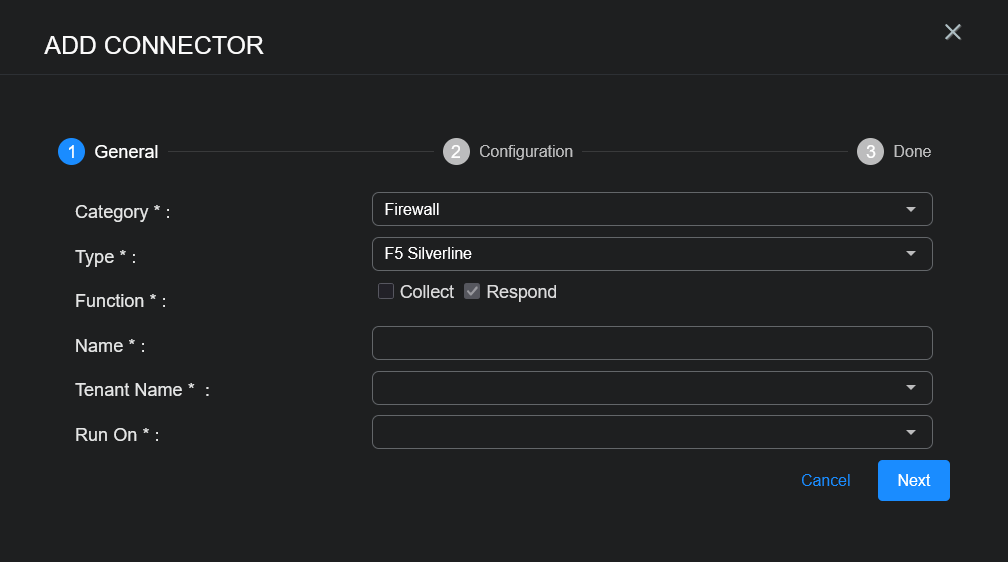 To add a new F5 Silverline firewall connector in Stellar Cyber:
