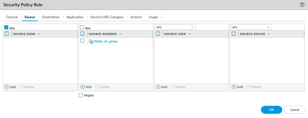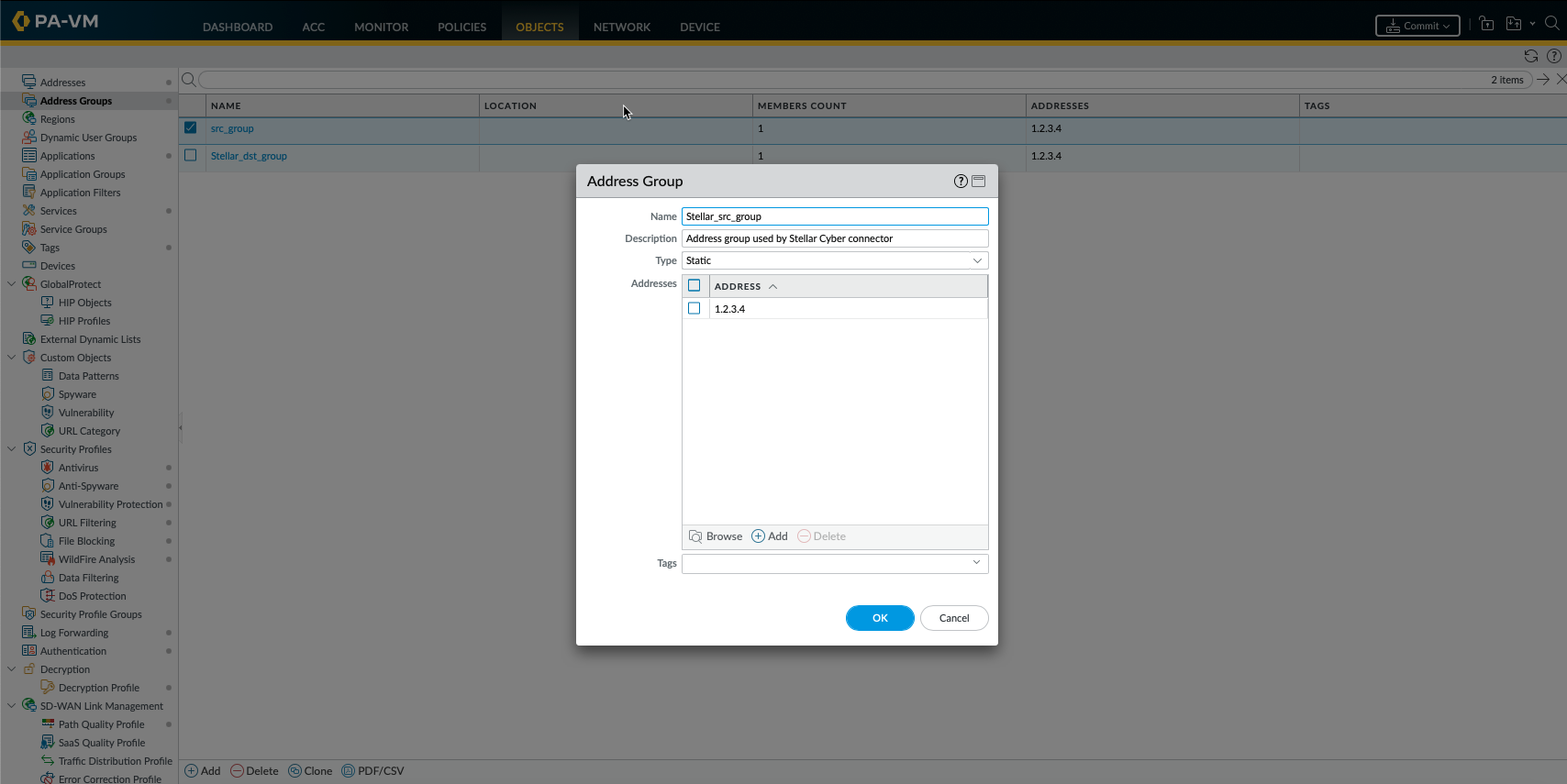 1. Create an address group called Stellar_src_group. You must include at least one IP address.