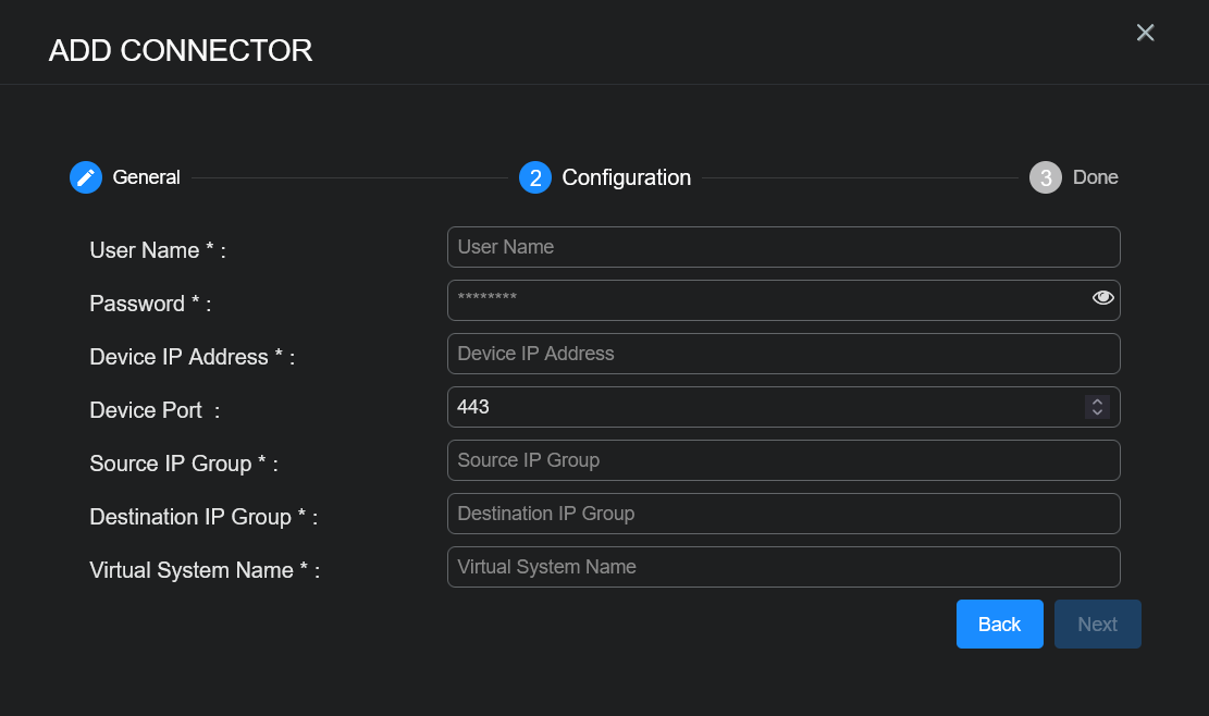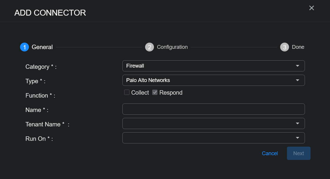 With the firewall rules in place, you can add the Palo Alto Networks firewall connector in Stellar Cyber: