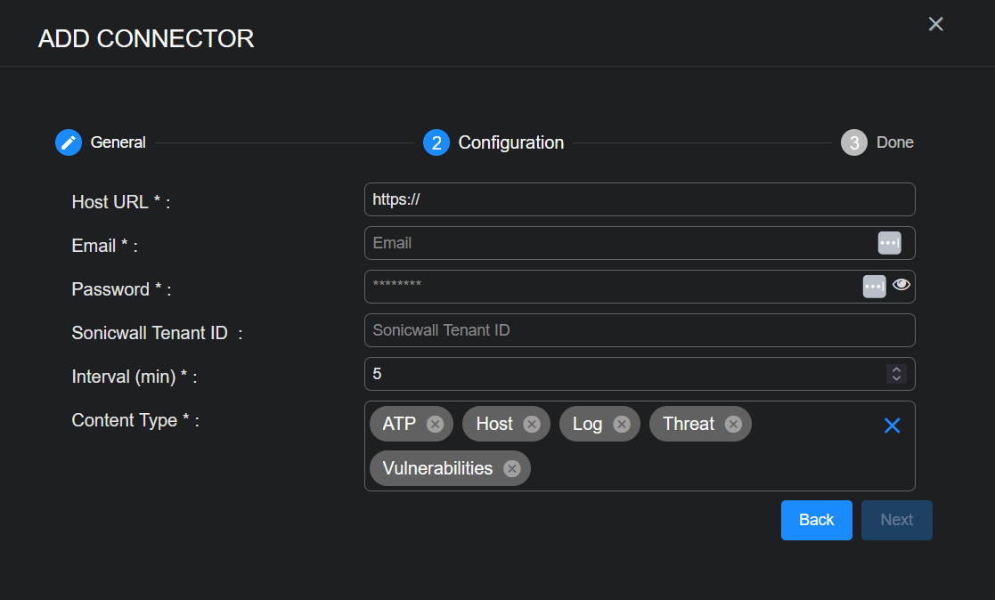 Host URL, Email, Password, and Sonicwall Tenant ID
