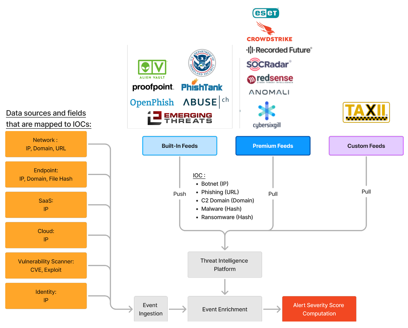 Custom Feeds: User-configurable sources using TAXII or TSV formats.