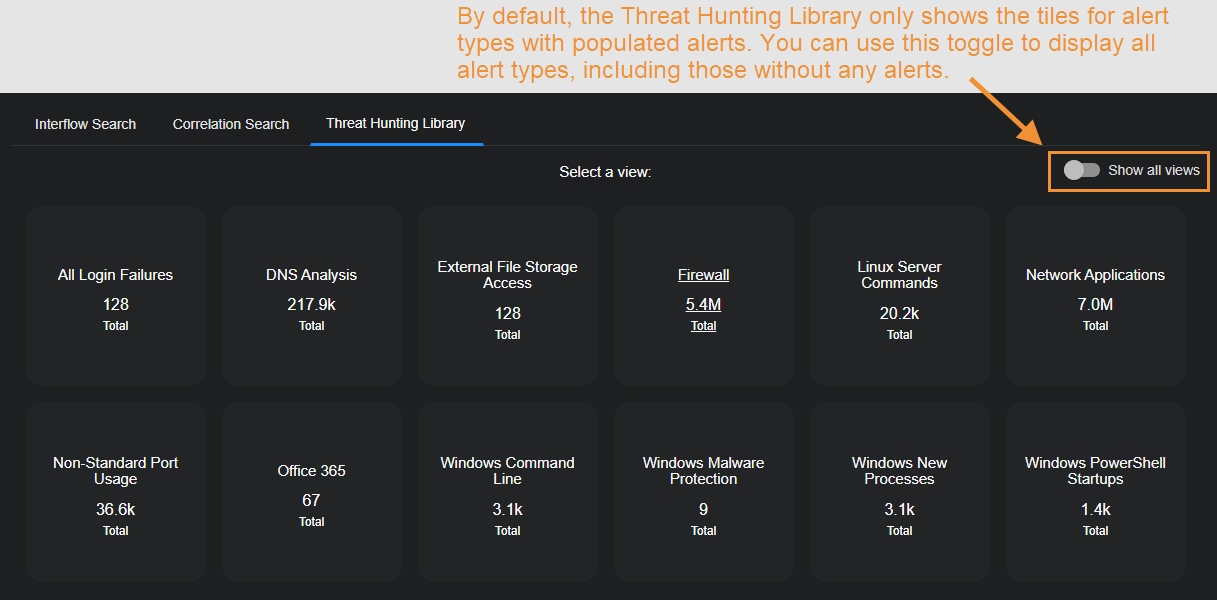 By default, the Threat Hunting Library only displays tiles for alert types that are populated with alerts. As illustrated below, you can use the Show all views option to toggle the display between showing all alert types and only those populated with alerts.