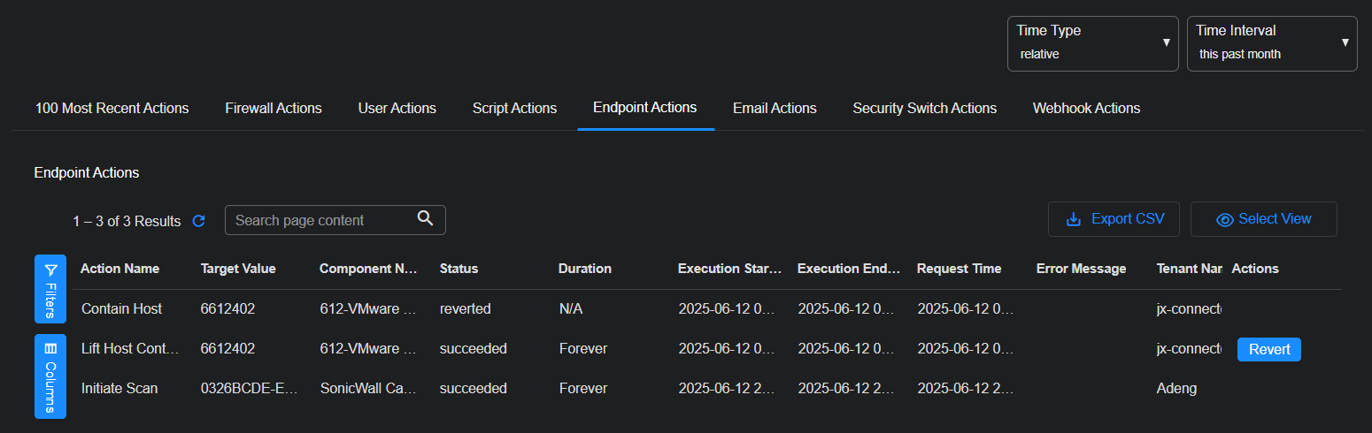 If the host was contained, you can click Revert to lift the containment from a host. This triggers a new endpoint action Lift Containment to appear in the table.