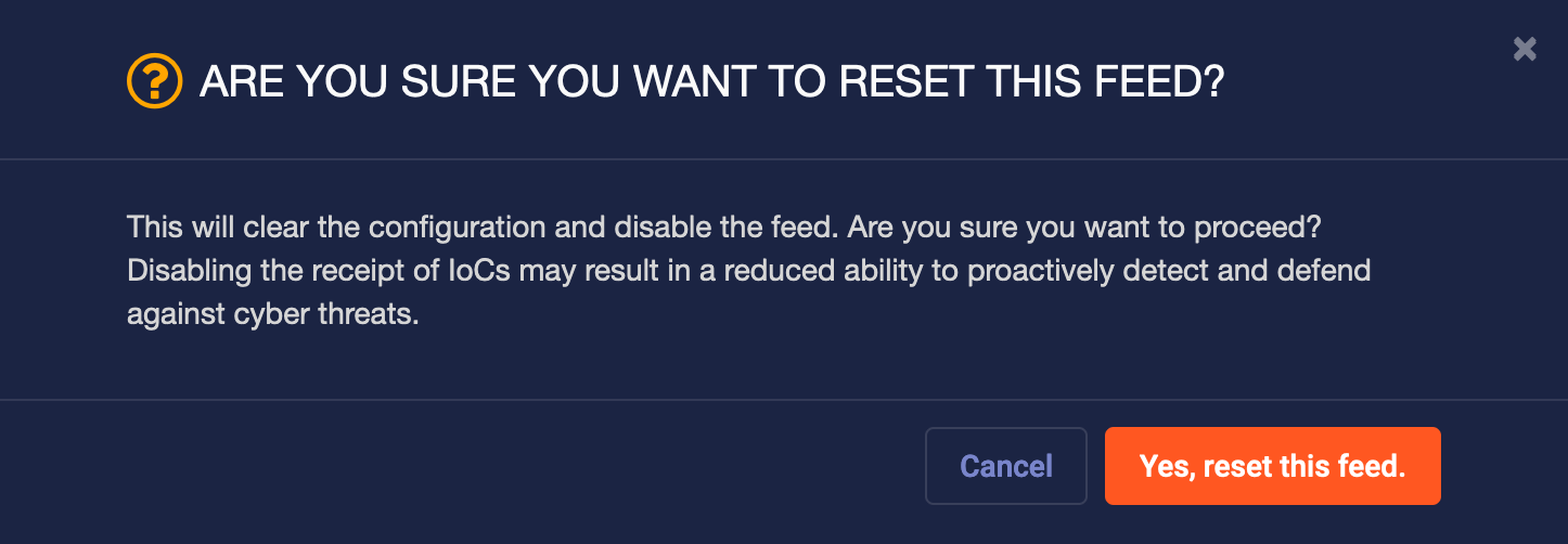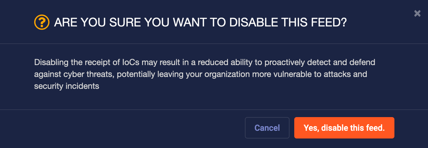 To disable a feed, click the toggle in the Enabled column from Enabled to Disabled. The following confirmation is displayed.