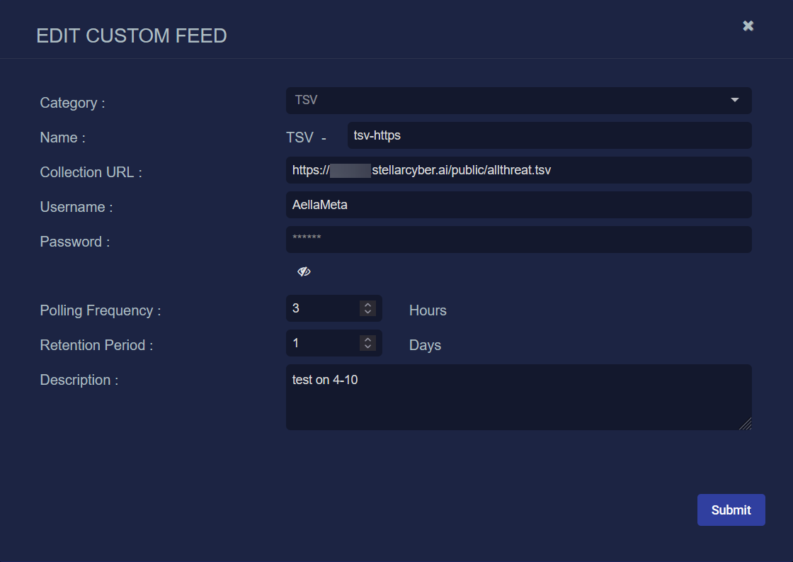 Descriptions of Custom feeds can be edited; Descriptions of Built-in and Premium feeds are provided by Stellar Cyber and cannot be edited