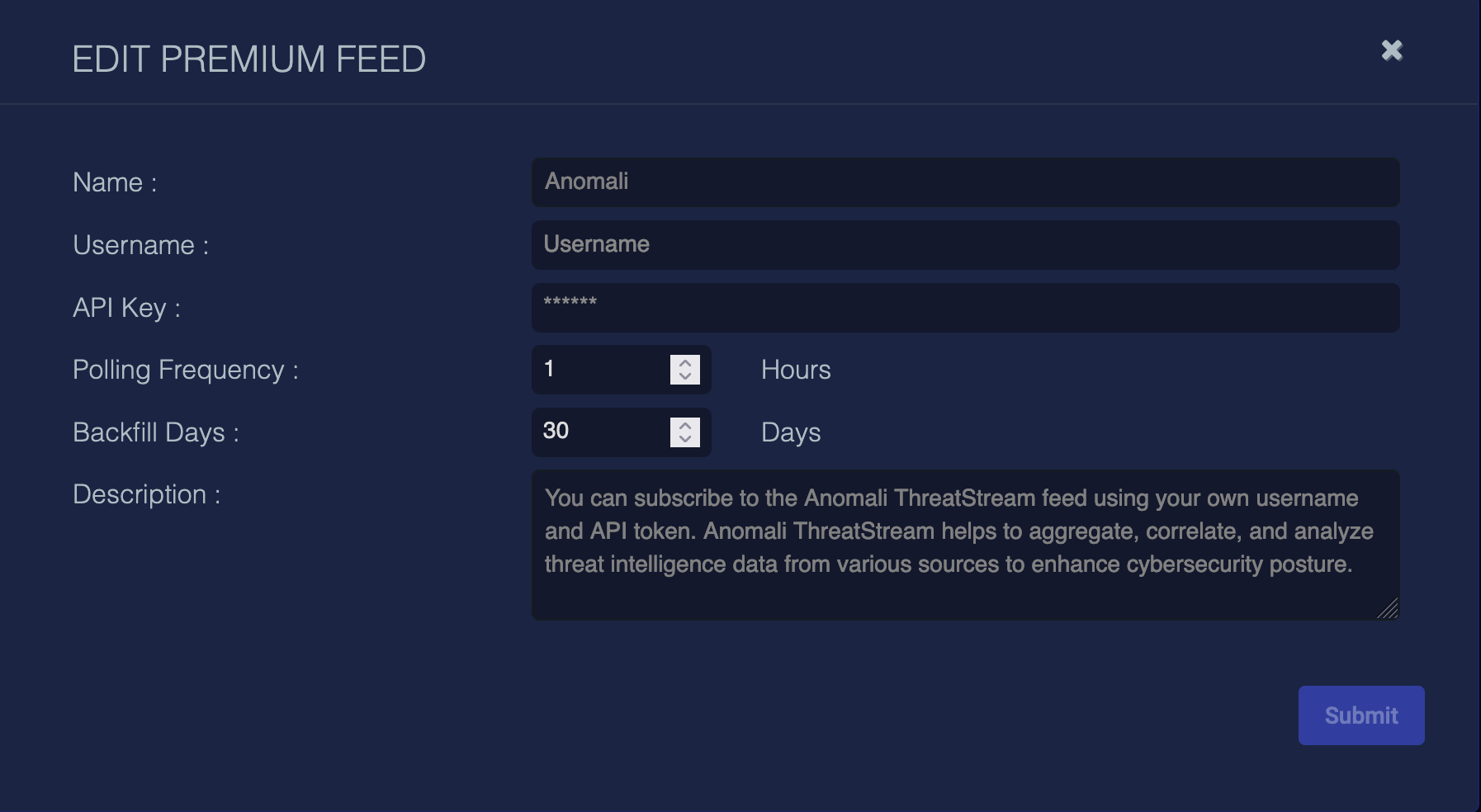 You can subscribe to the Anomali ThreatStream feed using your own username and API token. Anomali ThreatStream helps to aggregate, correlate, and analyze threat intelligence data from various sources to enhance cybersecurity posture. |