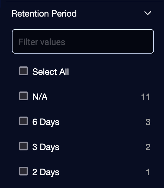 For Retention Period, select a retention period using the check boxes or Select All. The number of feeds with each retention period is displayed on the right.
