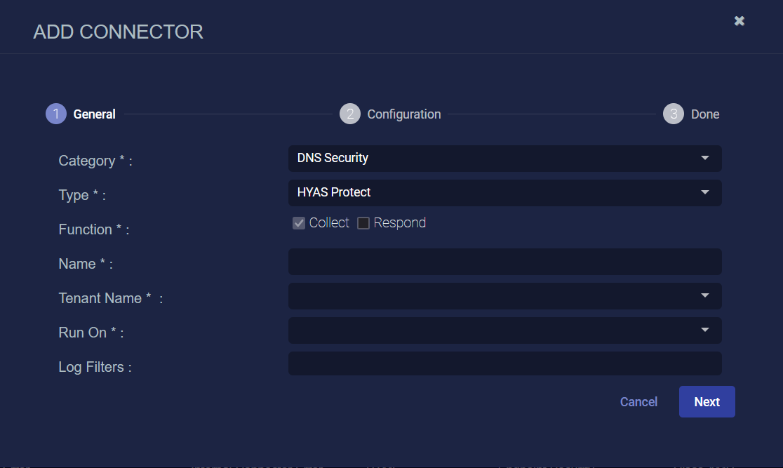 This connector allows Stellar Cyber to ingest logs from HYAS Protect and add the records to the data lake. This connector integrates with the HYAS Protect API to query for DNS log reports. It supports ingesting records, generating assets, and alerting on data from HYAS Protect to monitor DNS logs using the Stellar Cyber platform.
