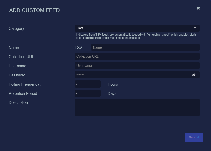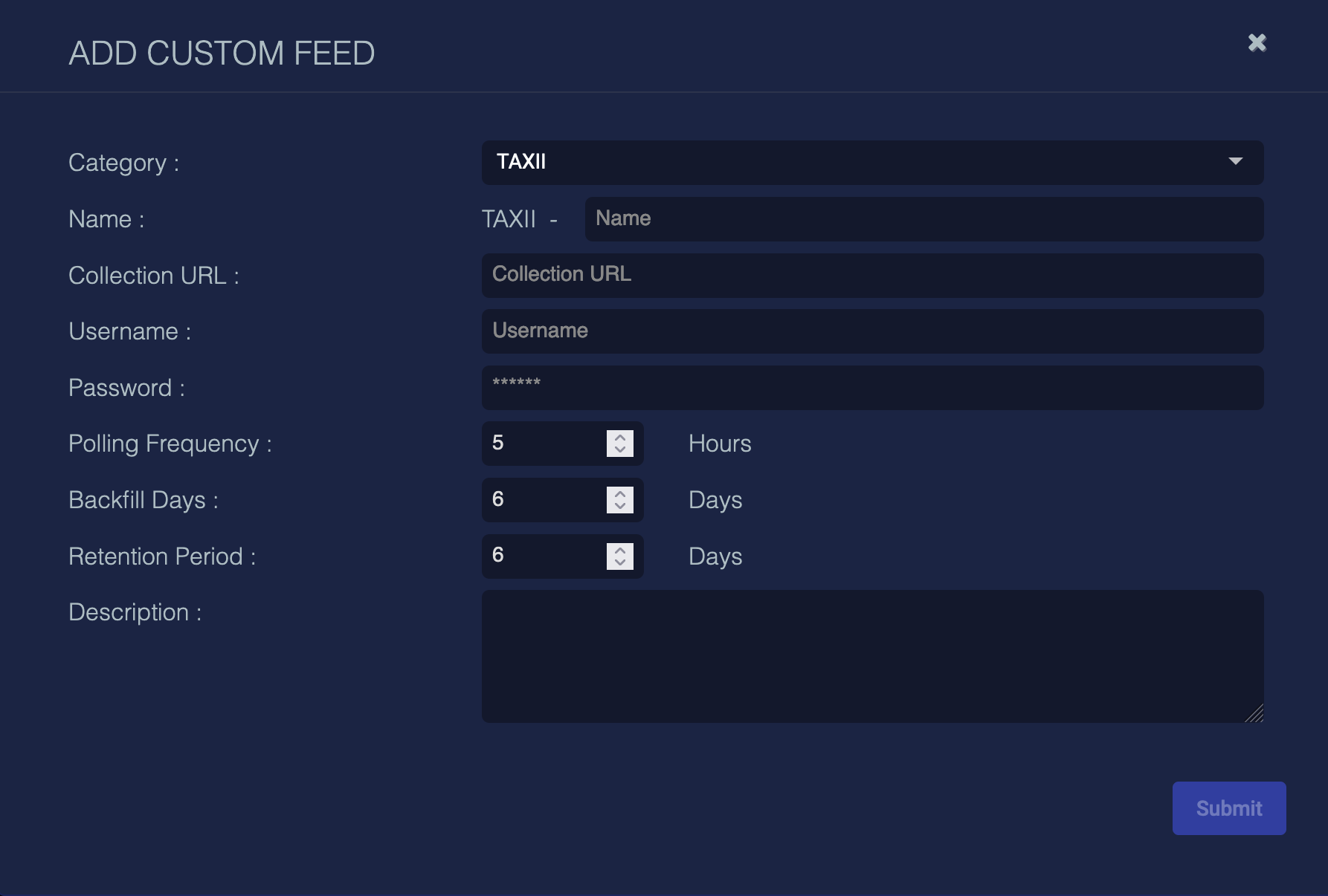 Custom feeds (TAXII and TSV) are added using the Create button and then providing a collection URL and authentication credentials (see Adding Custom Feeds)