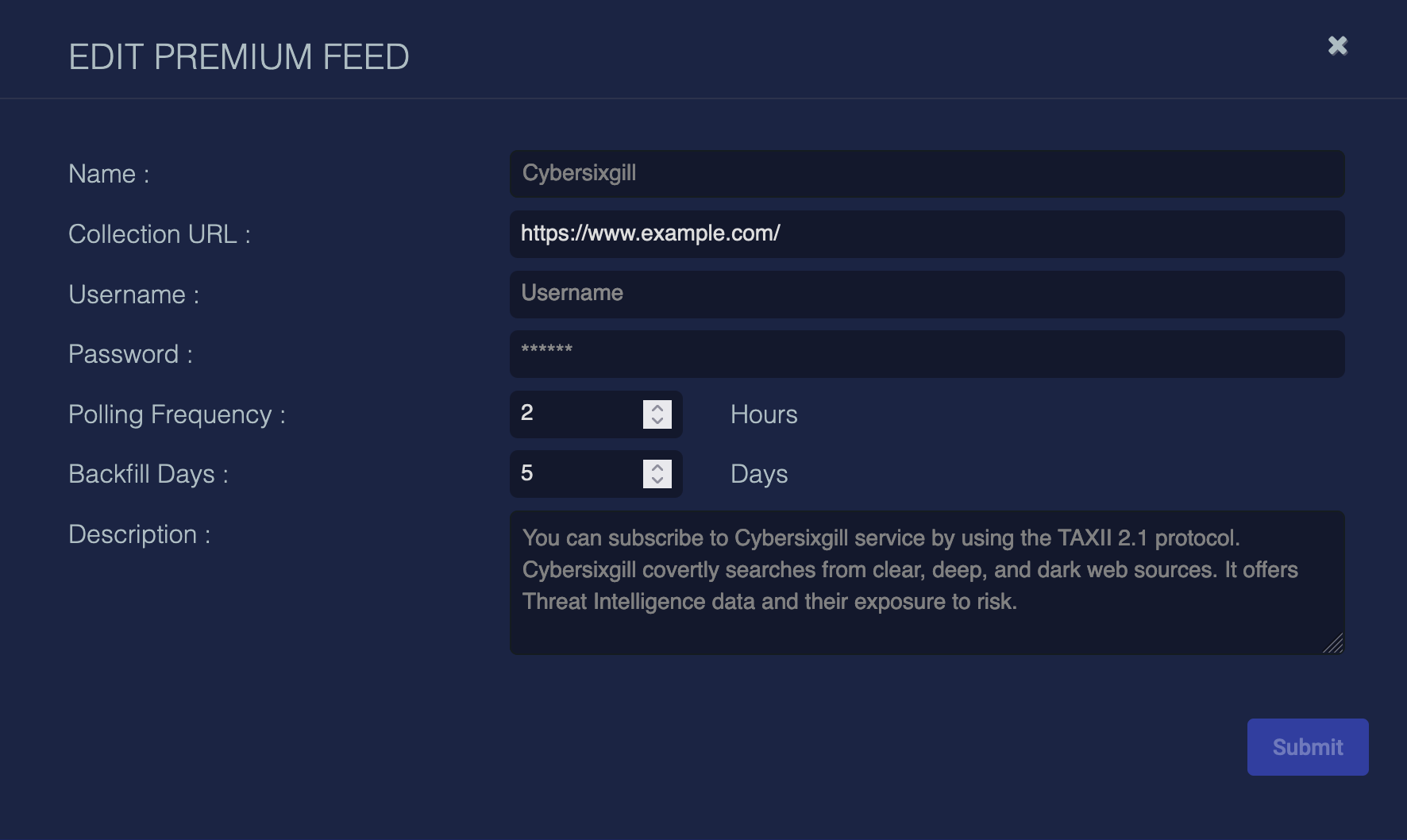 Premium feeds are provided by Stellar Cyber and include Cybersixgill and Anomali ThreatStream. You configure them with credentials that you purchase.