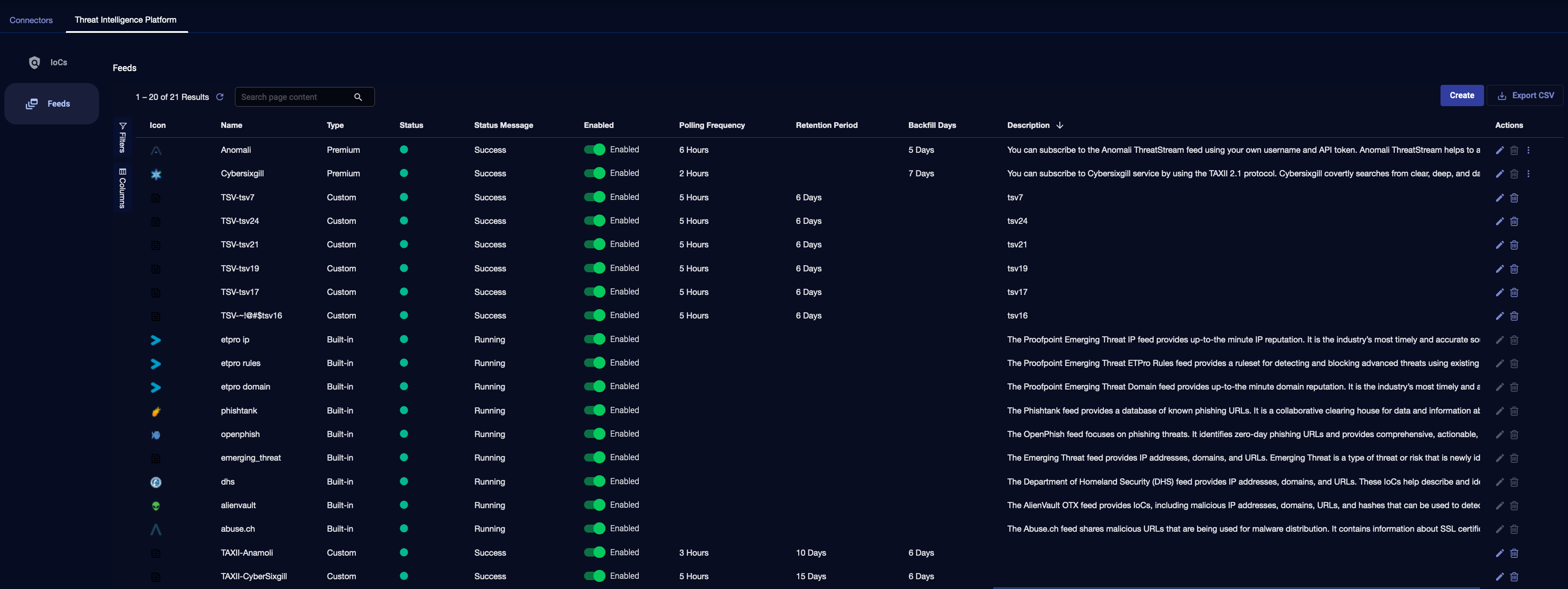 All Built-in, Custom, and Premium feeds can be Enabled and Disabled; when Enabled, IoCs are fetched and then stored locally; when Disabled, IoC ingestion stops