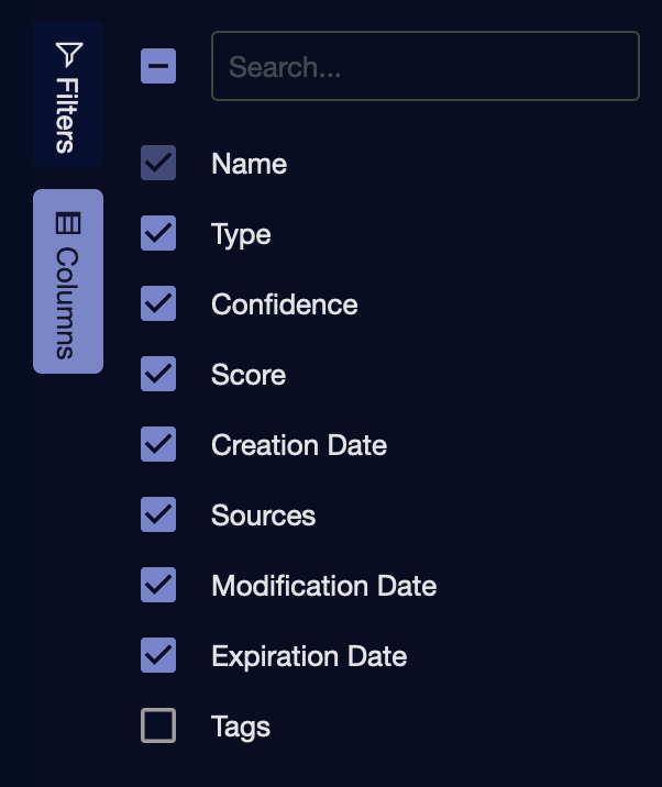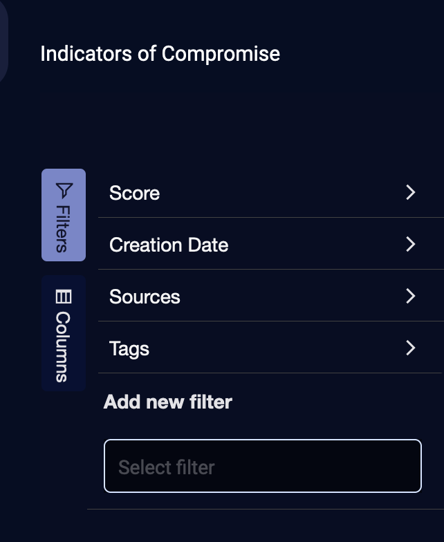 You can export Selected Columns or All Columns to a maximum of 10,000 IoCs. If there are more than 10,000, use filters and sort to select the 10,000 you want to export.