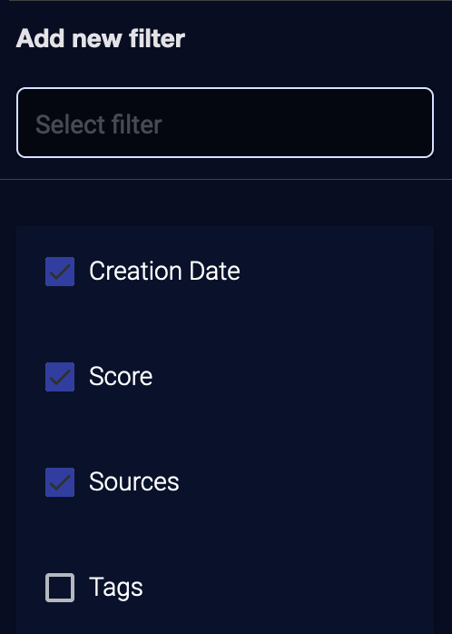 If a defined filter is unselected, you can click the search box under Add new filter to select a filter from the dropdown.