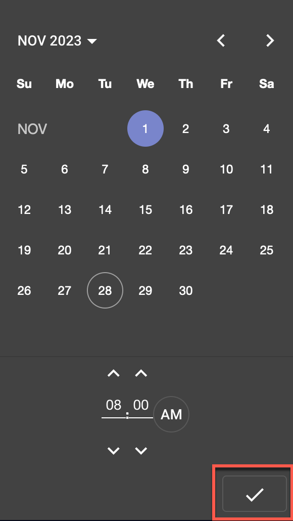 Select a date, select a time, then click the checkmark.