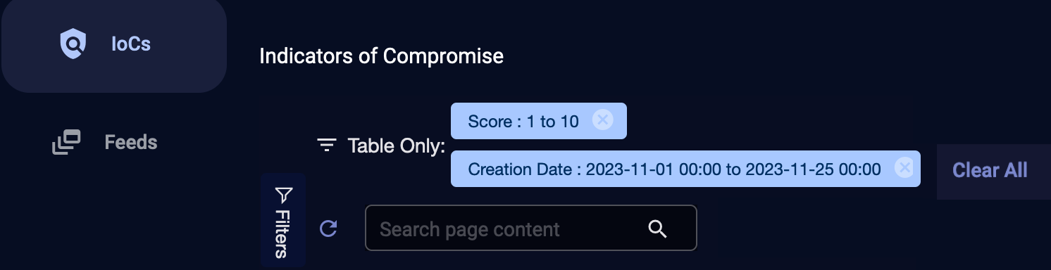 The IoCs table displays all IoCs ingested from all feeds, except those IoCs that are expired or revoked. In addition, the table displays IoCs imported by the user.