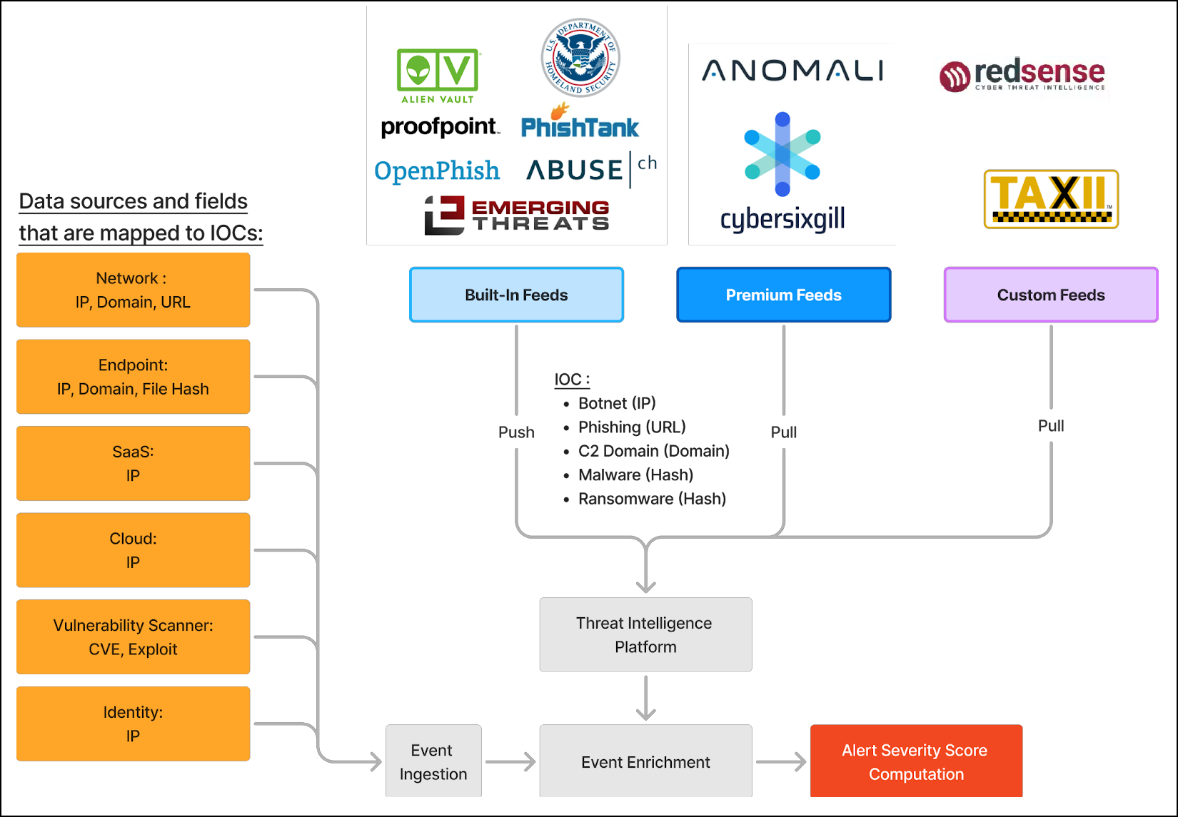 Custom Feeds: User-configurable sources using TAXII or TSV formats.