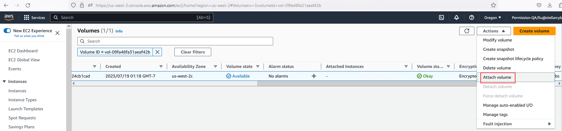 Return to the Volumes list, select the entry for the encrypted volume, and choose Attach volume from the Actions dropdown.