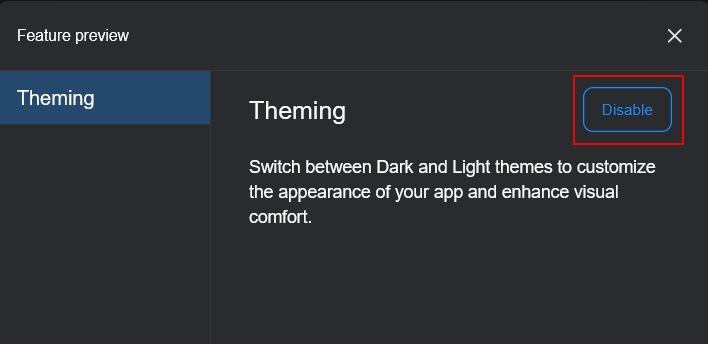 In the Feature preview dialog, click Enable for Theming.