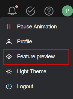 Click the right-most icon to view the menu items: Set/Unset as homepage, Pause Animation, Profile, Feature Preview, Light/Dark Theme, and Logout. In this example, it is a